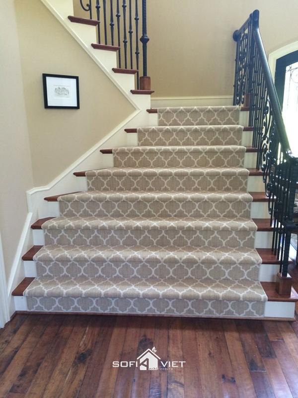 Một cách làm mới lại cầu thang nhanh nhất là sơn mới lại chúng cùng màu với không gian. Sửa chữa lại vật liệu bề mặt bậc thang và đừng quên sơn sửa lại khu vực lan can cầu thang. Bạn có thể thêm một chút cái nhìn hiện đại với thảm họa tiết này cho khối cầu thang truyền thống nhà mình.