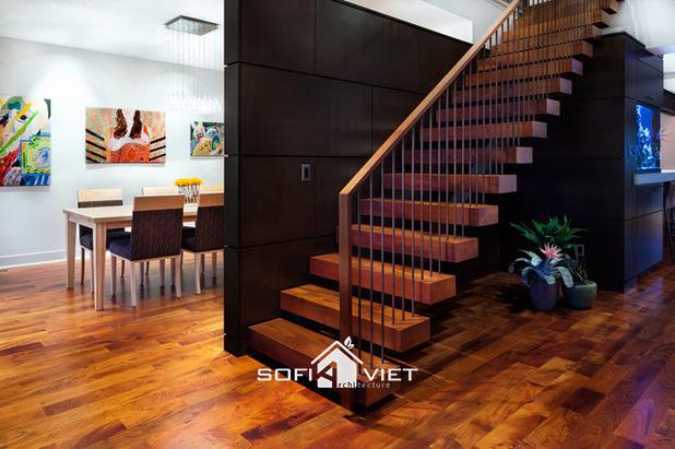 Sẽ là một cái nhìn tuyệt vời cho không gian này đi kèm với một chi phí xây dựng không hề nhỏ. Cầu thang mở với cấu trúc thép để hỗ trợ chịu lực được giấu trong những hộp bậc thang gỗ. Việc đảm bảo an toàn cho trẻ em vui chơi và các vị khách tới thăm nhà còn nhiều mới mẻ, hãy làm độ rộng các bậc thang mở nhỏ hơn 4 inches (~10cm) để khó có thể bị lọt qua.